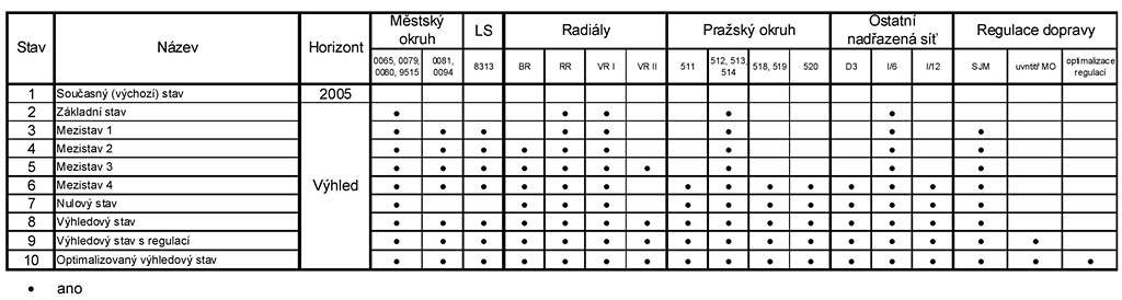 Výpočty byly provedeny na variantním uspořádání stavu komunikační sítě na území hl. m. Prahy a jeho regionu. Přehled provozu jednotlivých staveb v hodnocených stavech je proveden v tabulce na obrázku. V následujících kapitolách jsou porovnány především přínosy optimalizovaného výhledového stavu NKS (NKS kompletní, zavedena optimalizační opatření) oproti nulovému stavu (posuzované stavby a VR nejsou v provozu, ostatní stavby NKS kompletní).