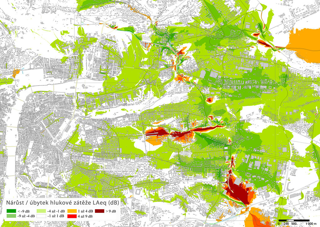 V současné době jsou požadované hygienické limity hluku pro chráněné venkovní prostory staveb zejména v noční době překročeny v okolí téměř celé sítě nadřazených komunikací. Z hlediska hlukové zátěže obyvatel je nepříznivé, že velká většina výše uvedených komunikací (mimo zprovozněných částí Městského okruhu) vede obytnou městskou zástavbou a nelze z důvodů minimálních prostorových dispozic realizovat v okolí těchto komunikací protihluková opatření. Porovnání výhledové situace po roce 2015 bez souboru staveb (nulový stav) a výhledového stavu se souborem staveb je dokumentováno v rozdílové mapě (viz následující obrázek).