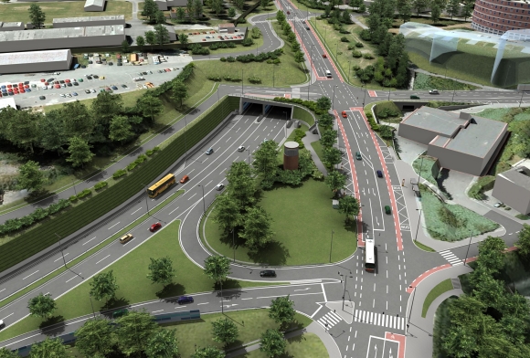 Pohled na MÚK Jinonice a východní portál tunelu Jinonice (© 2012 PUDIS & SATRA & ARTOO)