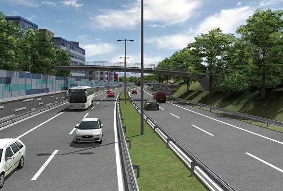 Pohled Radlickou radiálu v cca km 0,400 a na lávku přes Radlickou radiálu (© 2012 PUDIS & SATRA & ARTOO)