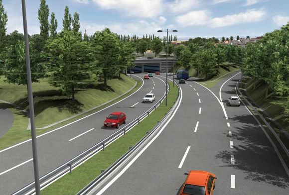 Pohled na západní portál tunelu Butovice a prostor MÚK Butovice (© 2012 PUDIS & SATRA & ARTOO)