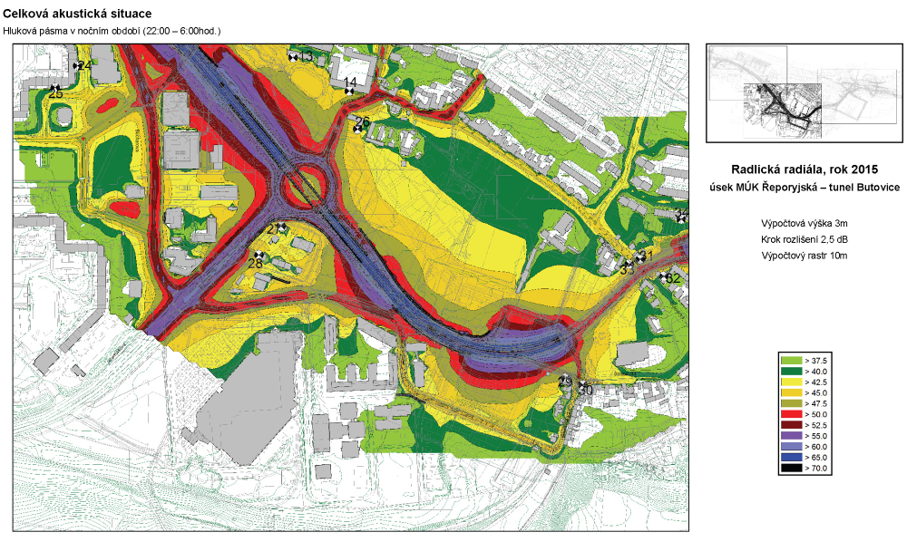 Úsek Řeporyjská – tunel Butovice, Celková akustická situace, noc (© 2001-2012 sdružení PUDIS – SATRA)