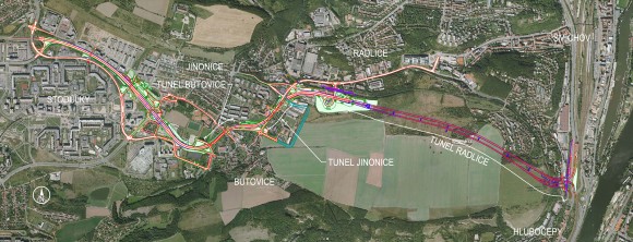 Přehledná situace trasy Radlické radiály s vyznačením tunelových úseků, návrh DÚR (© 2012 sdružení PUDIS – SATRA)