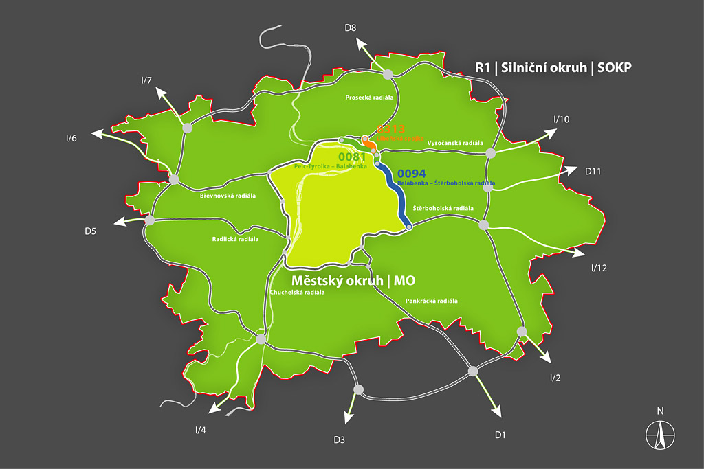 Sí hlavních komunikací s vyznaèením východní èásti MO a Libeòské spojky (© 2010 autoøi projektu)